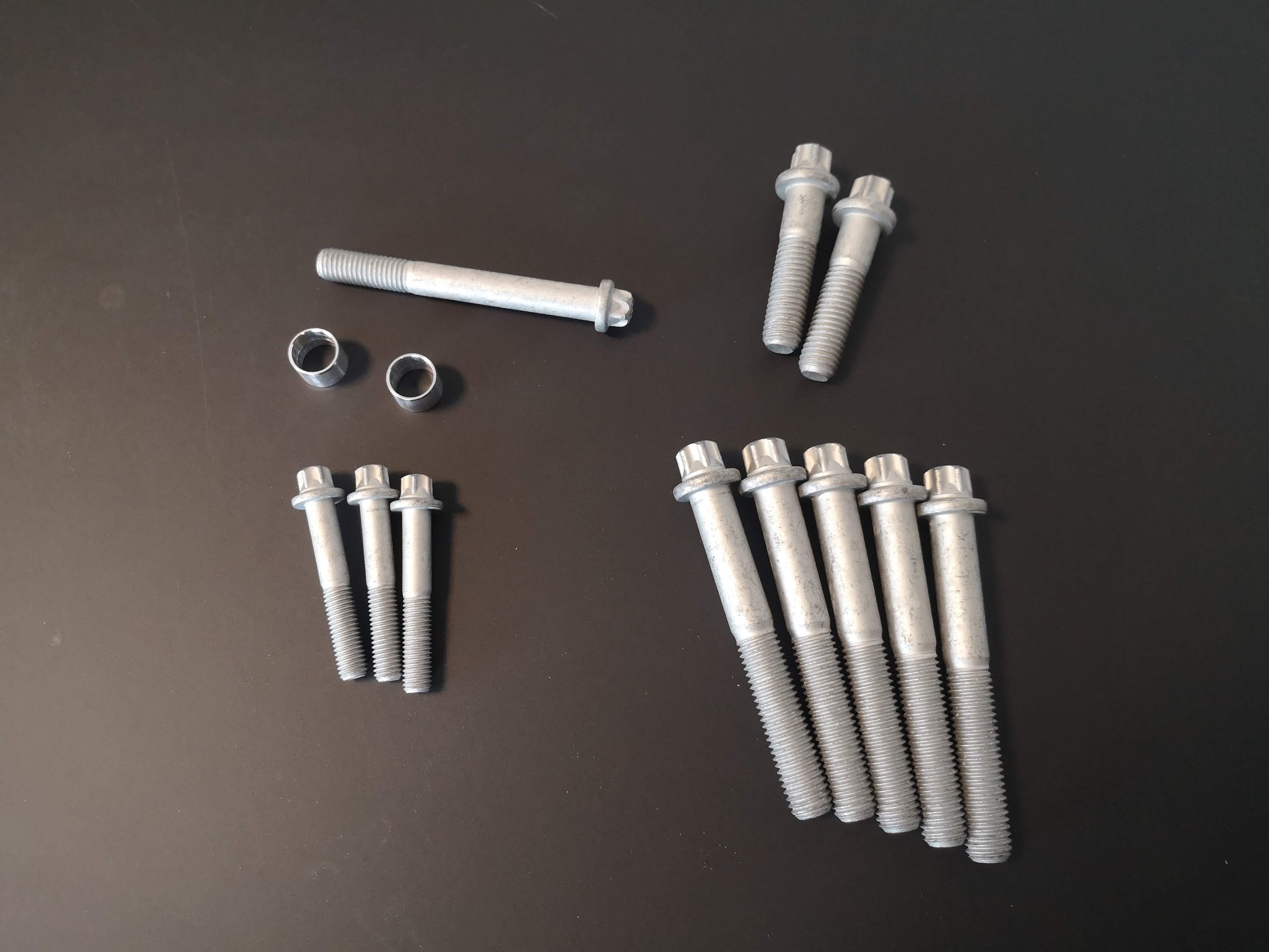 Set van 11 bouten en 2 14.5mm richtbussen voor het vastzetten van je versnellingsbak. Originele BMW torx bakbouten.
